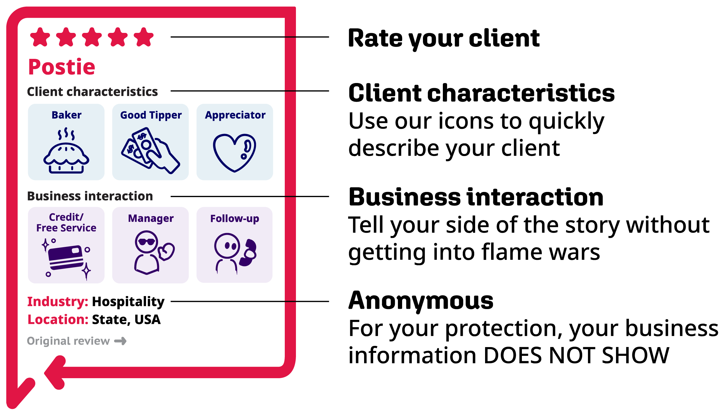 A Postie is what we call your client review on PostBack. Postie is also the name of our helper. We're a little obsessed. We've designed our client reviews to allow you to share information about a client without getting your business into trouble. By using our icons to review a client, you help keep your business protected from slander.